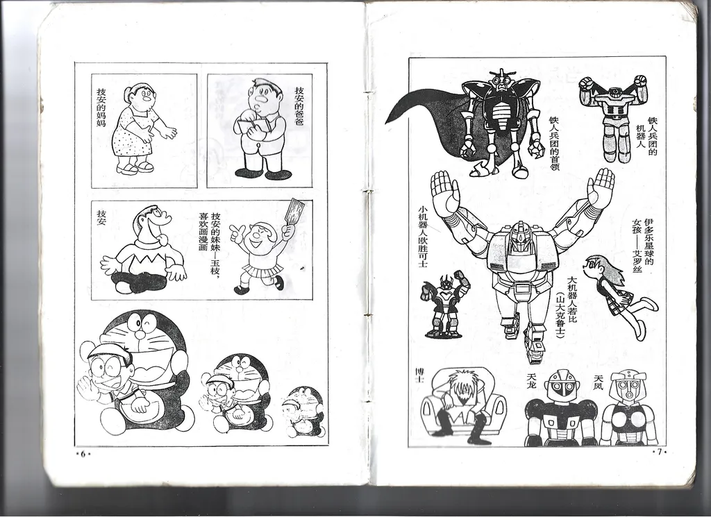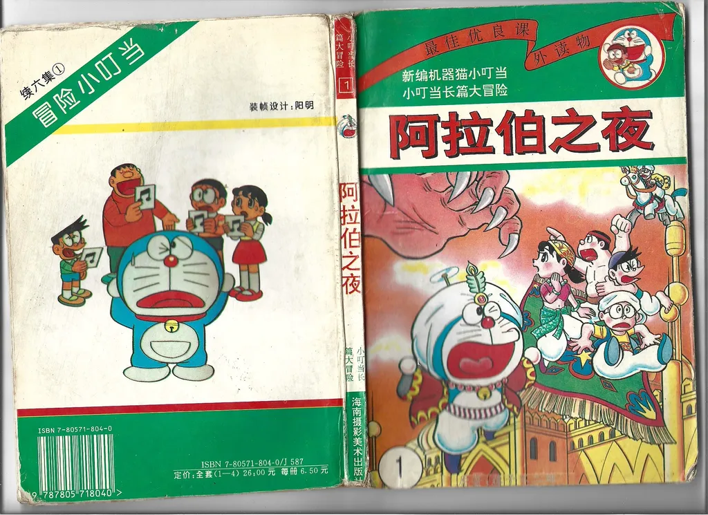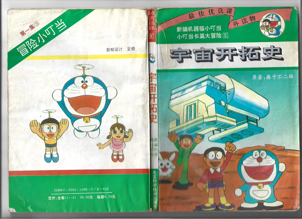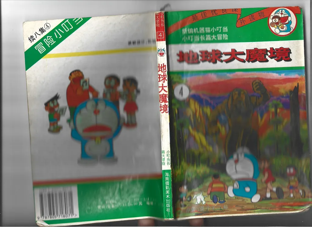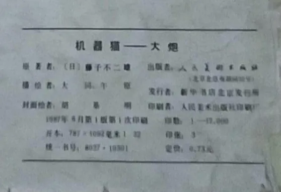 与此同时,在海峡另一边的中国大陆也正经历着相似的盗版漫画「黄金时代」。八十年代末期,日本盗版漫画开始在国内市场上出现。这些盗版漫画里很多是直接翻印自台湾的盗版。到 1992 年,中国加入伯尔尼公约,预示着盗版漫画黄金时代的终结。若干年后,中国大陆开始整治日本漫画盗版市场,以海南美术摄影出版社遭到查处作为标志性事件。自此之后,盗版漫画行业转入地下。从八十年代末到九十年代中期,中国大陆市场上充斥着盗版的日本漫画,时间上几乎和台湾的大盗版时代重合。哆啦A梦正是在这个时期被第一次引进中国大陆。目前可考的最早的盗版哆啦A梦来自人民美术出版社,发行于 1987 年。尽管人民美术出版社是国内最早获得哆啦A梦正版授权的出版社,这也算是该社的历史污点了。